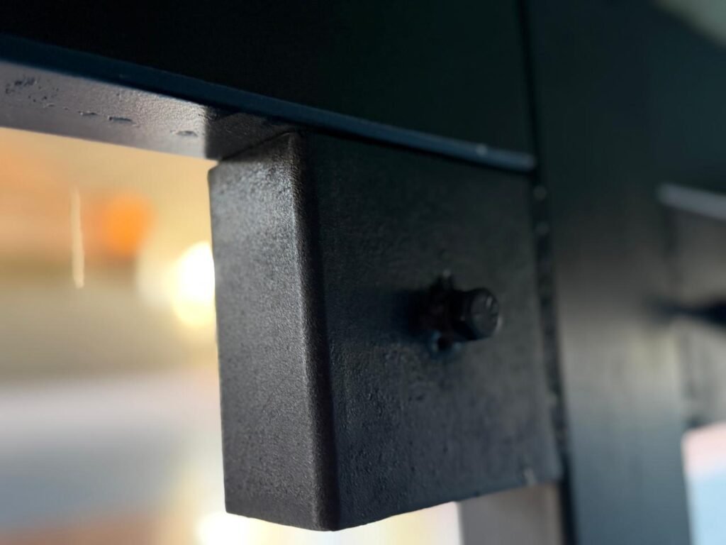Un perno roscado de fijación permite realizar el ajuste final, generando una unión firme y estable entre los componentes.